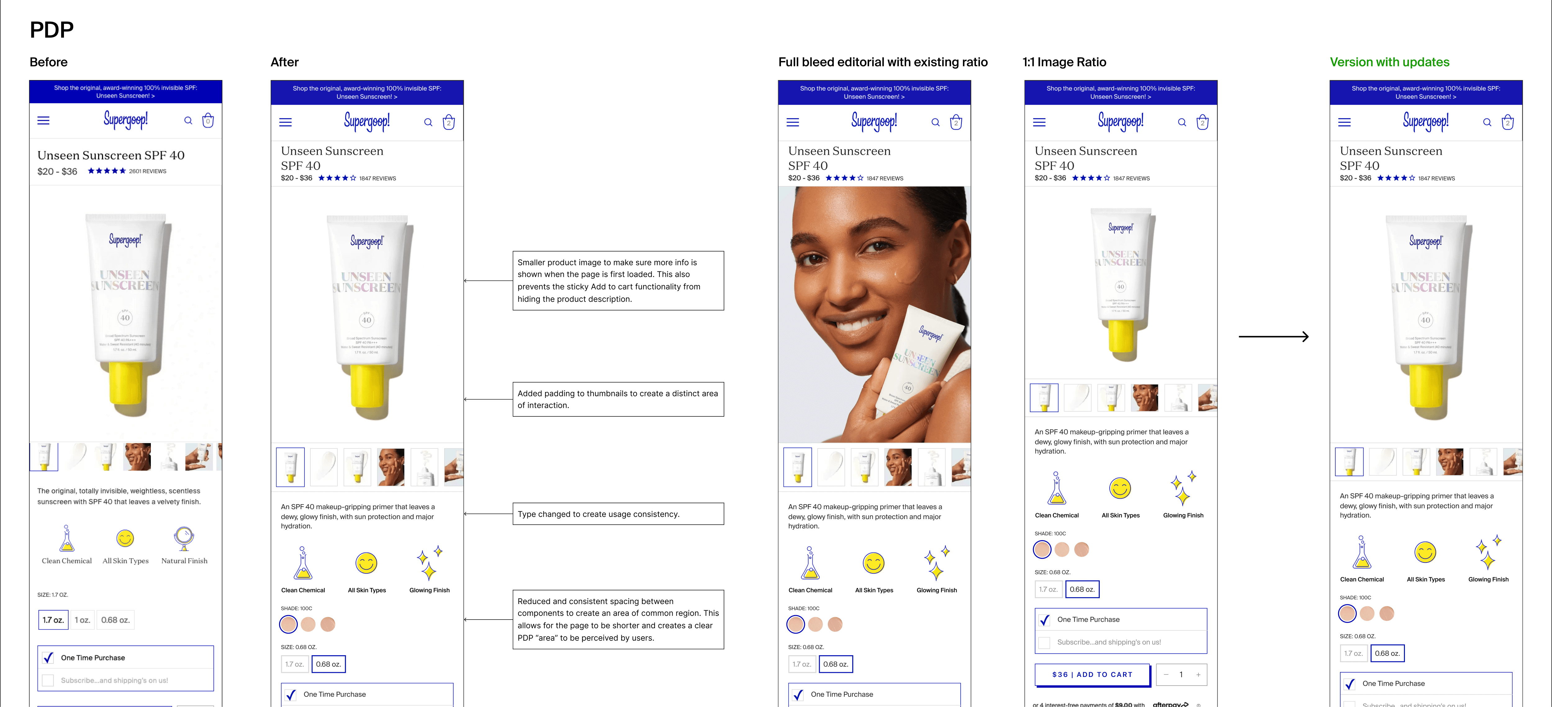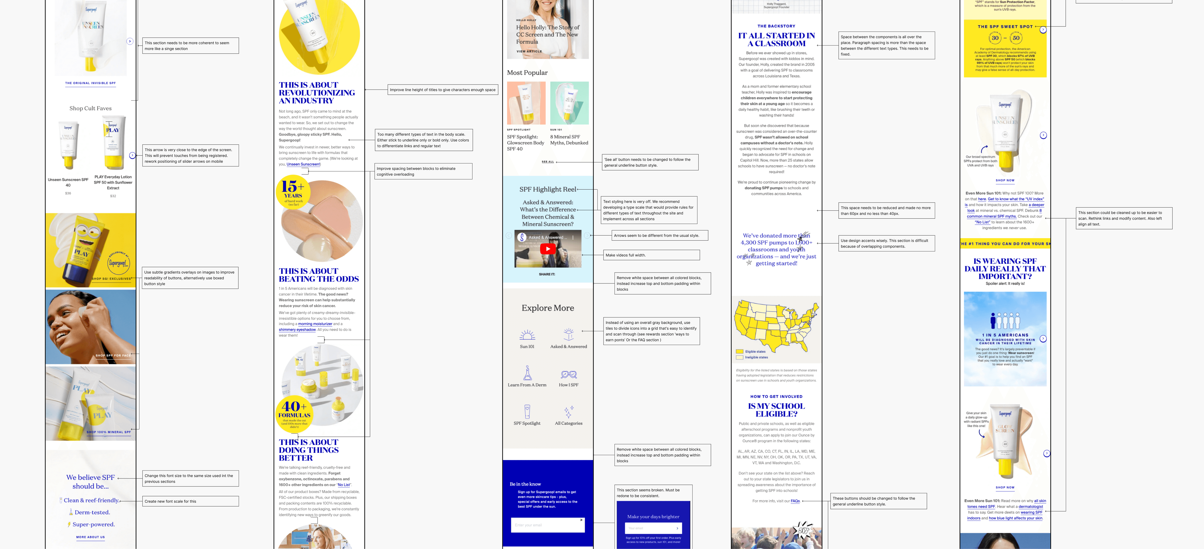 Mobile responsiveness: While Supergoop! has a mobile-friendly website, the user experience was not seamless. I was tasked with auditing their mobile designs to discover the potential issues with navigation, layout, or functionality specifically on mobile devices.